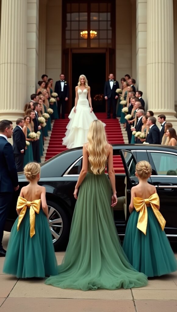 But one photo lingered online, shared thousands of times: A woman in emerald green stepping from a limousine, three children holding her hands, and a man in a tuxedo watching in stunned silence.