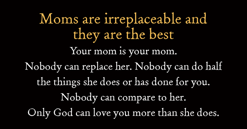Your mom is your mom. Nobody can replace her. Nobody can do half the things she does or has done for you.