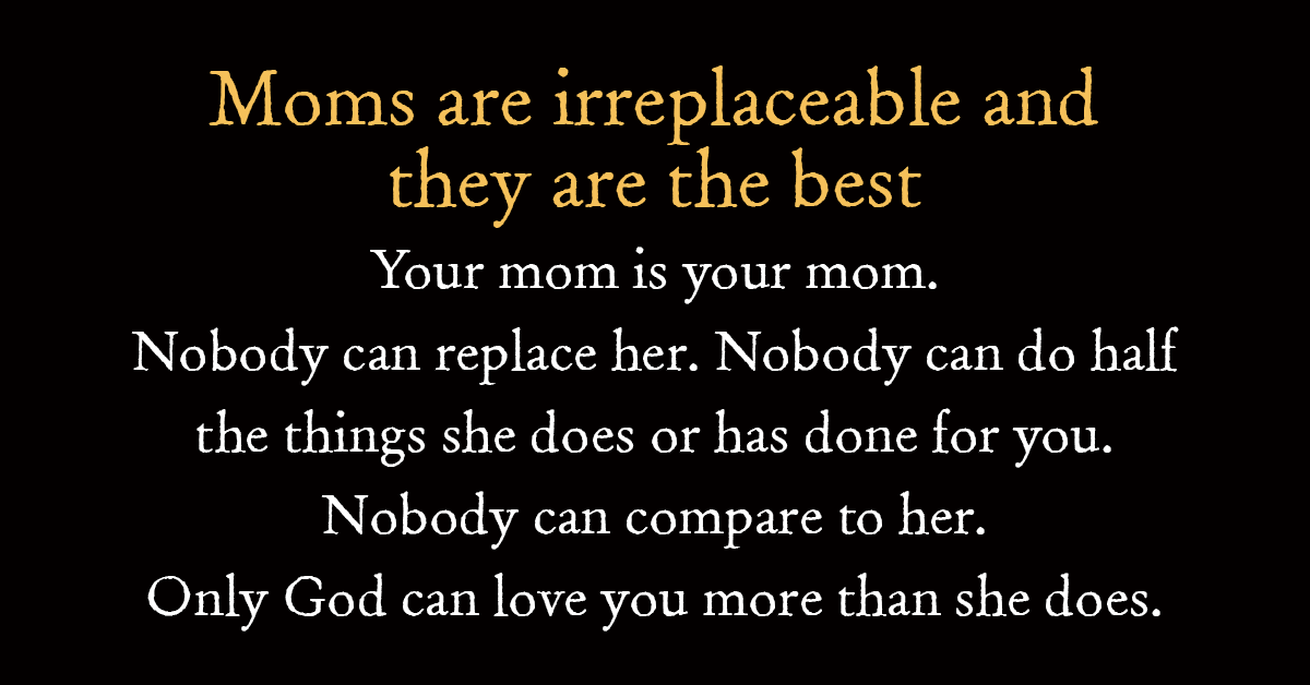 Moms are irreplaceable and they are the best. A little mistake they could have made when we were younger will determine our life in the future; a little mistake could have affected us physically mentally or emotionally, but here we are strong as ever. Appreciate your moms; they are angels in human form.